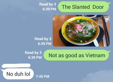 The Slanted Door 1 Ferry Building #3, Ferry Building Marketplace, San Francisco, CA 用餐完畢,我傳了以下簡訊給我妹妹,抱怨味道不地道。